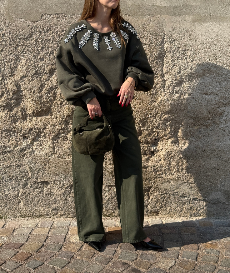 Felpa strass girocollo, vestibilitá oversized, felpata