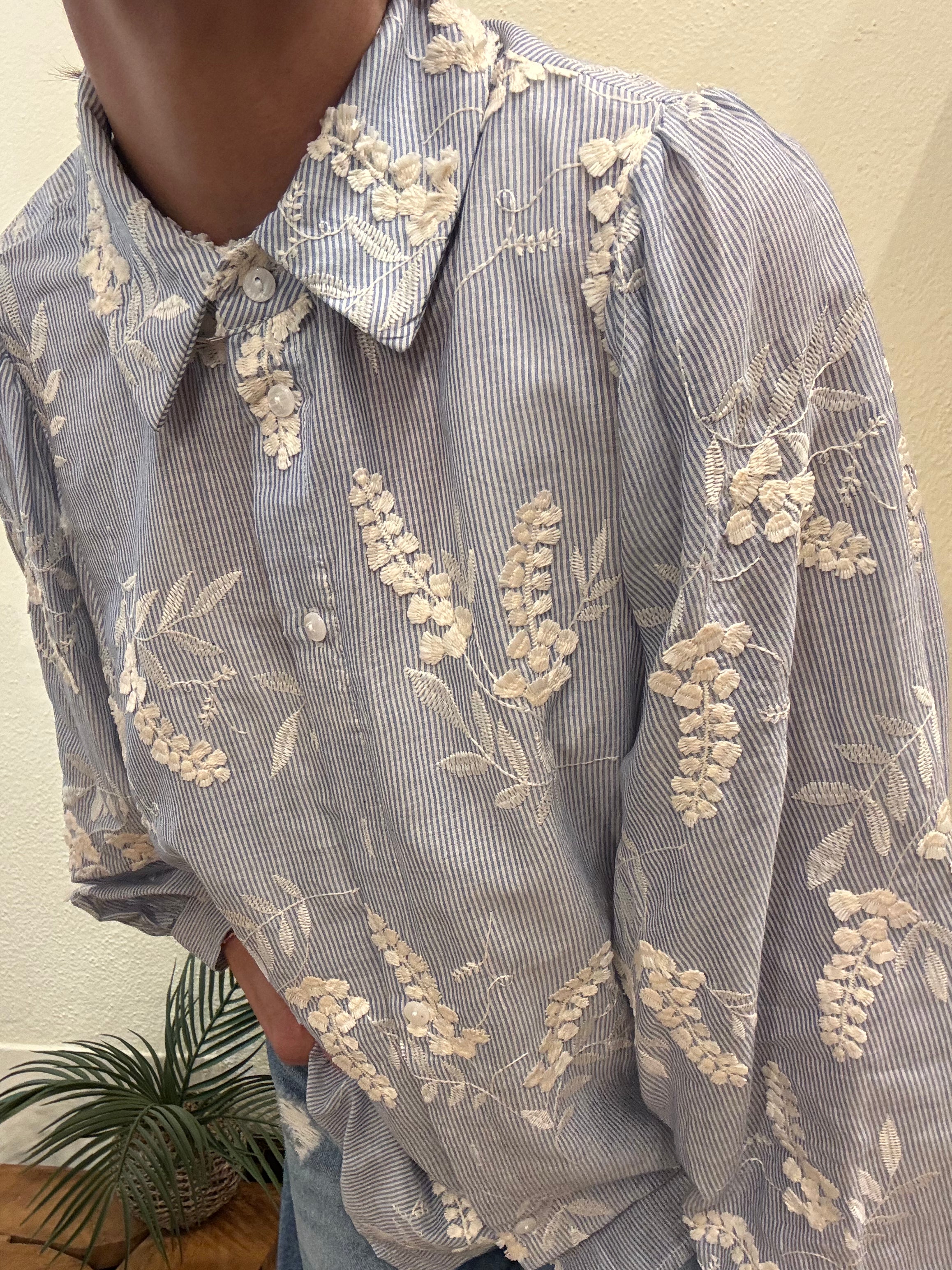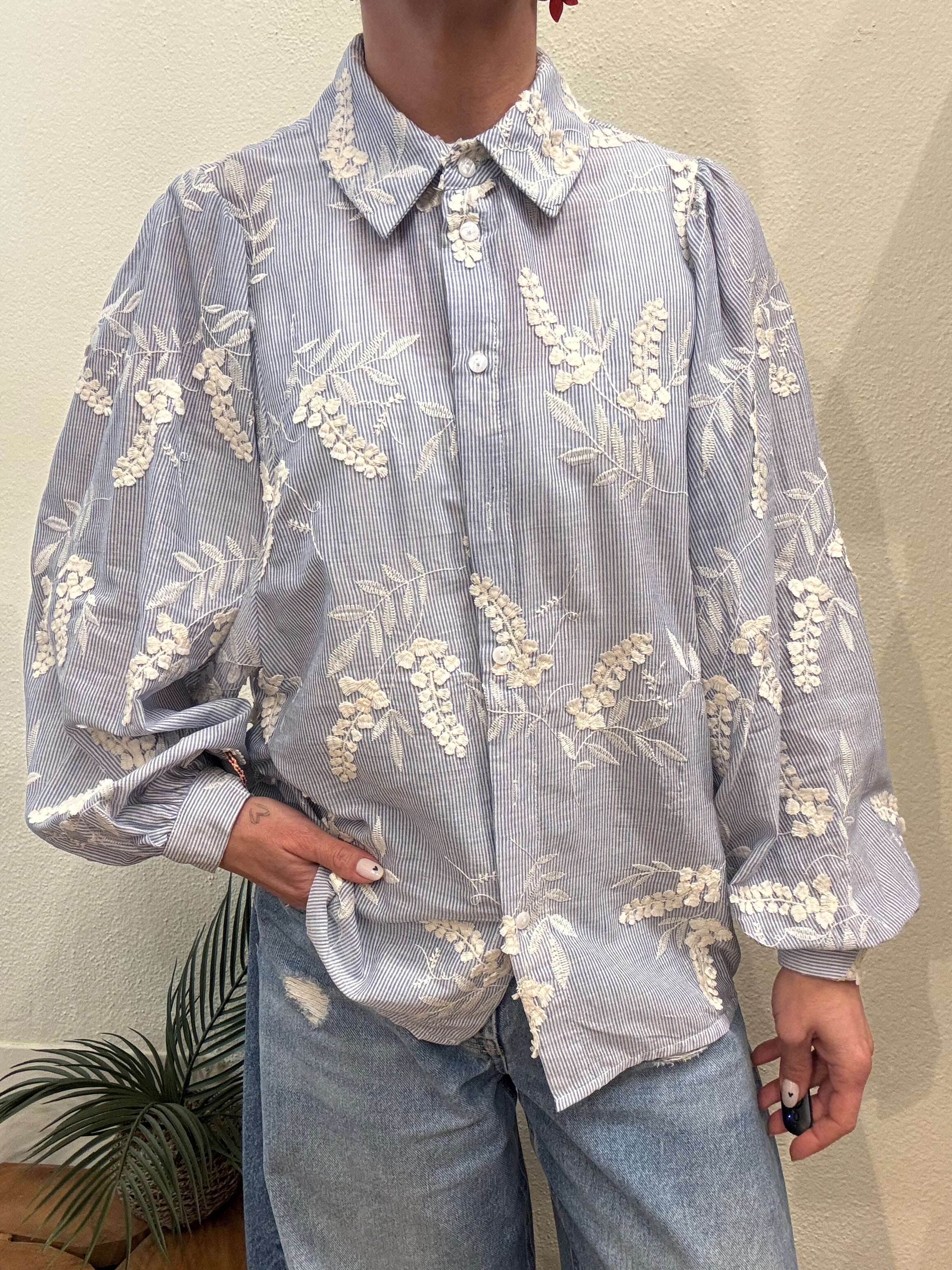 Camicia a righe sottili azzurro/bianco, fiori ricamati, vestibilitá regolare con manica baloon
