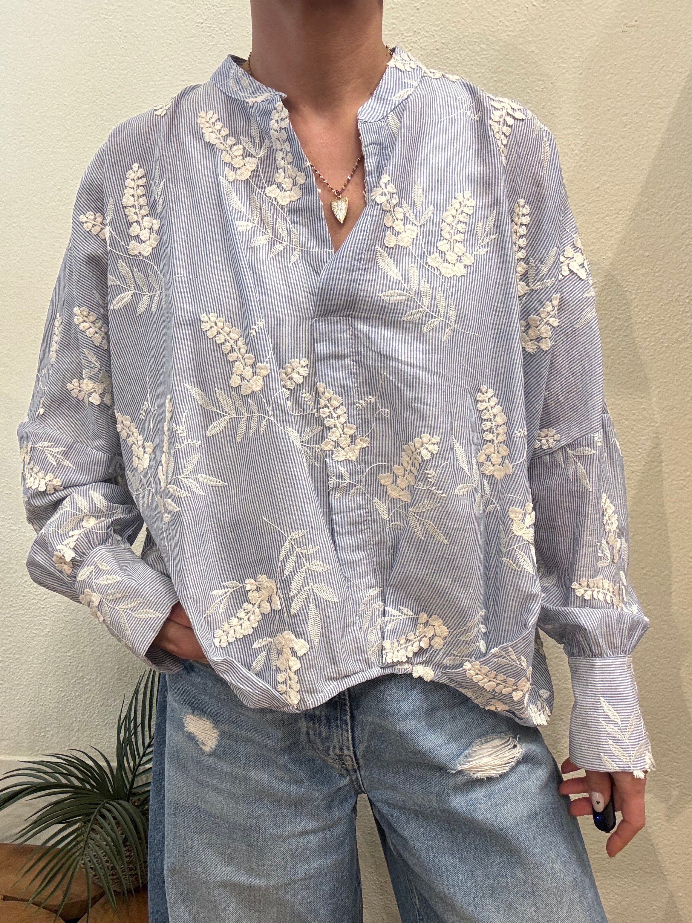 Camicia a righe sottili azzurro/bianco con collo alla coreana, fiori ricamati , manica con polsino