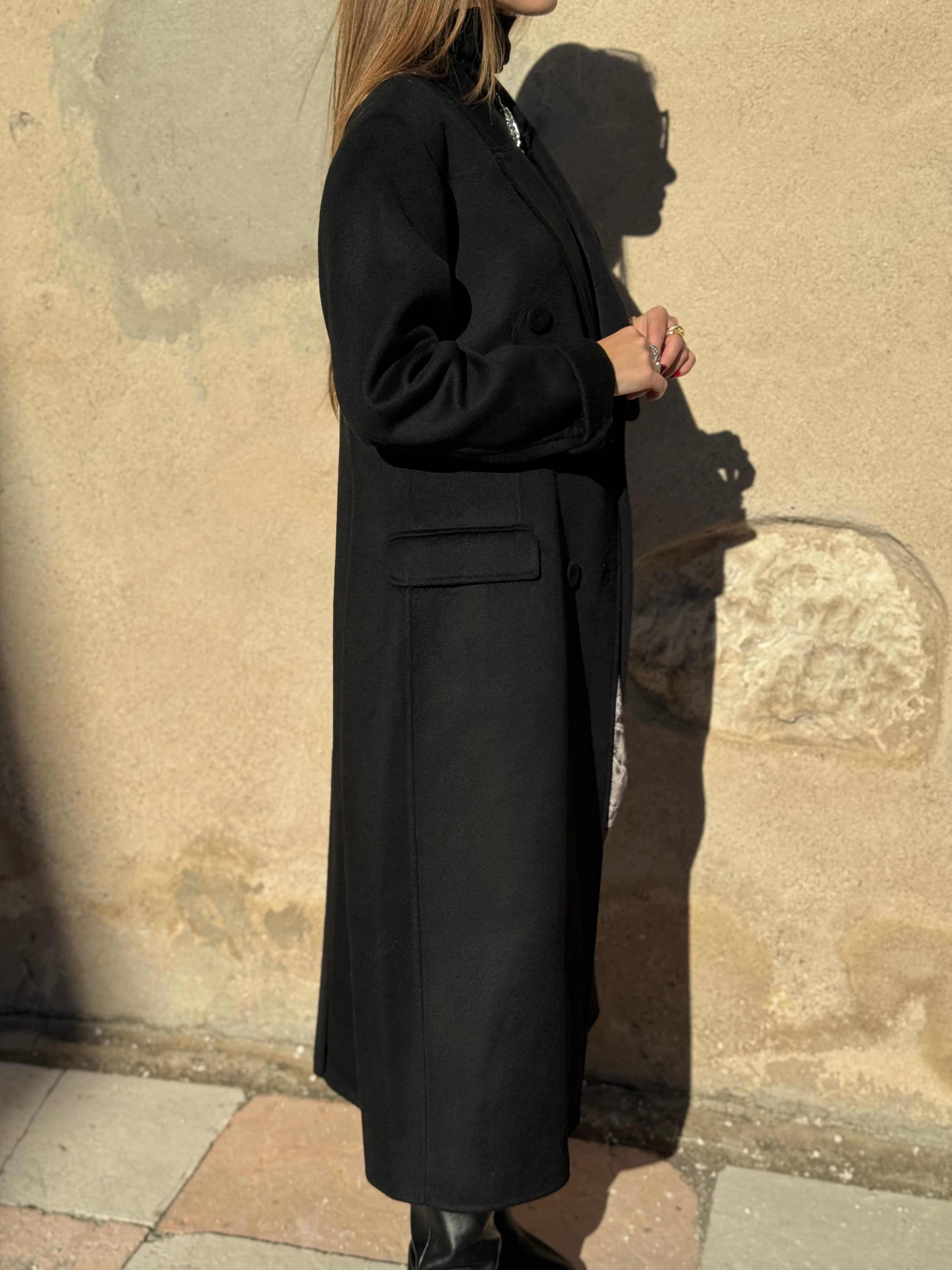 Cappotto doppiopetto, lunghezza al polpaccio, sfiancato in vita, con spacco sul retro