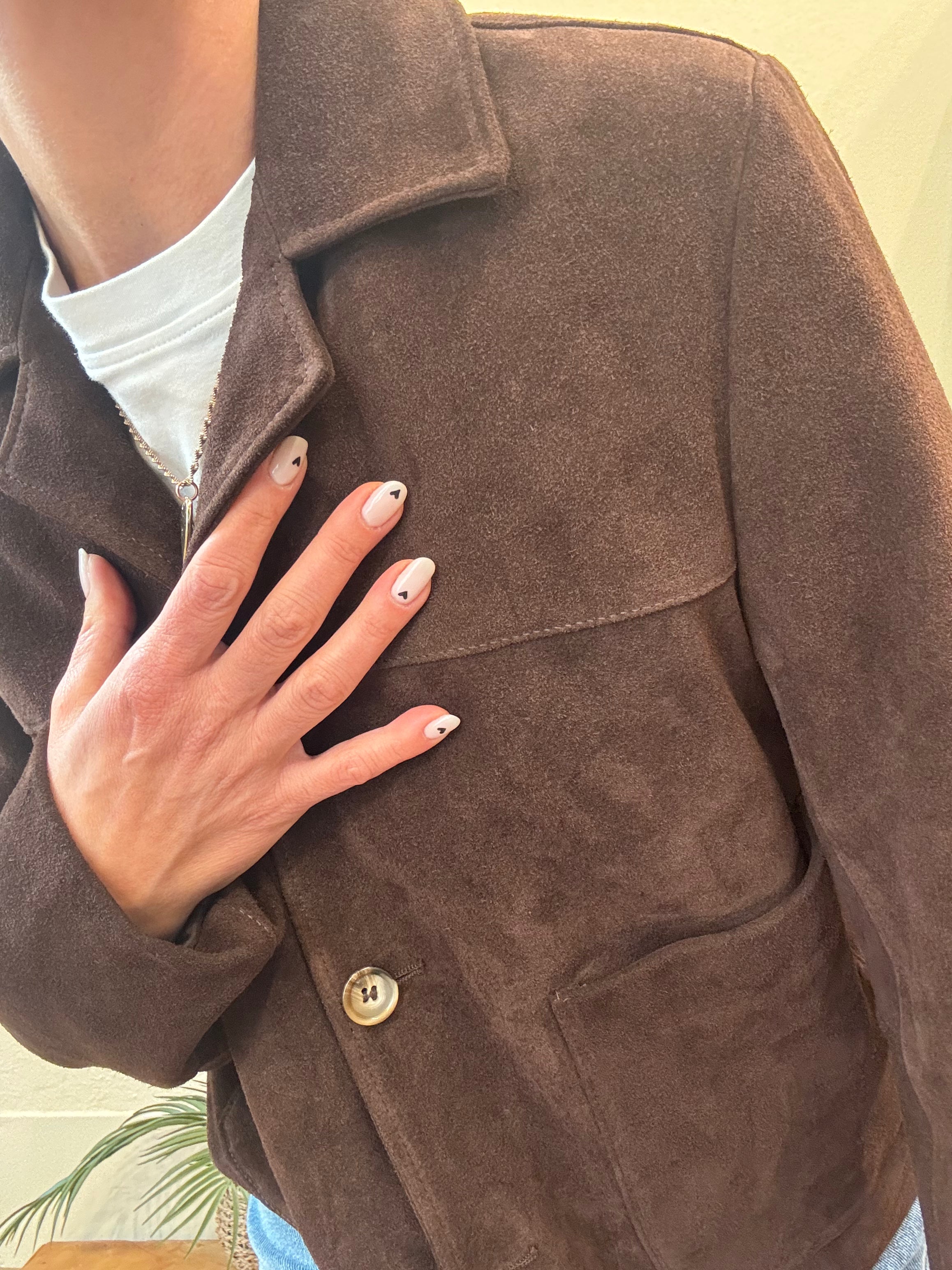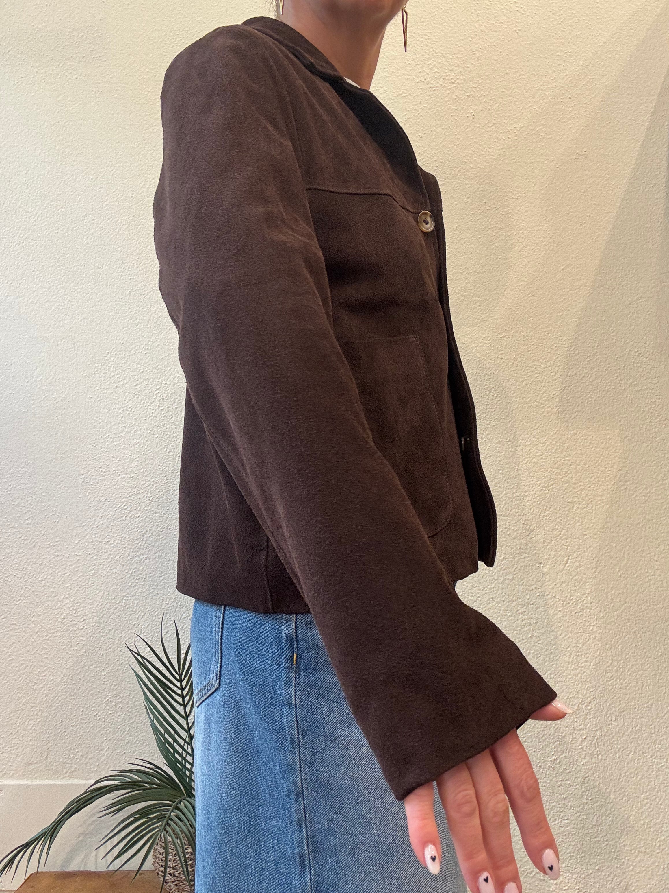 Giacca crop scamosciata con taglio a revers, chiusura con bottoni, tasche applicate sul davanti e cuciture a vista