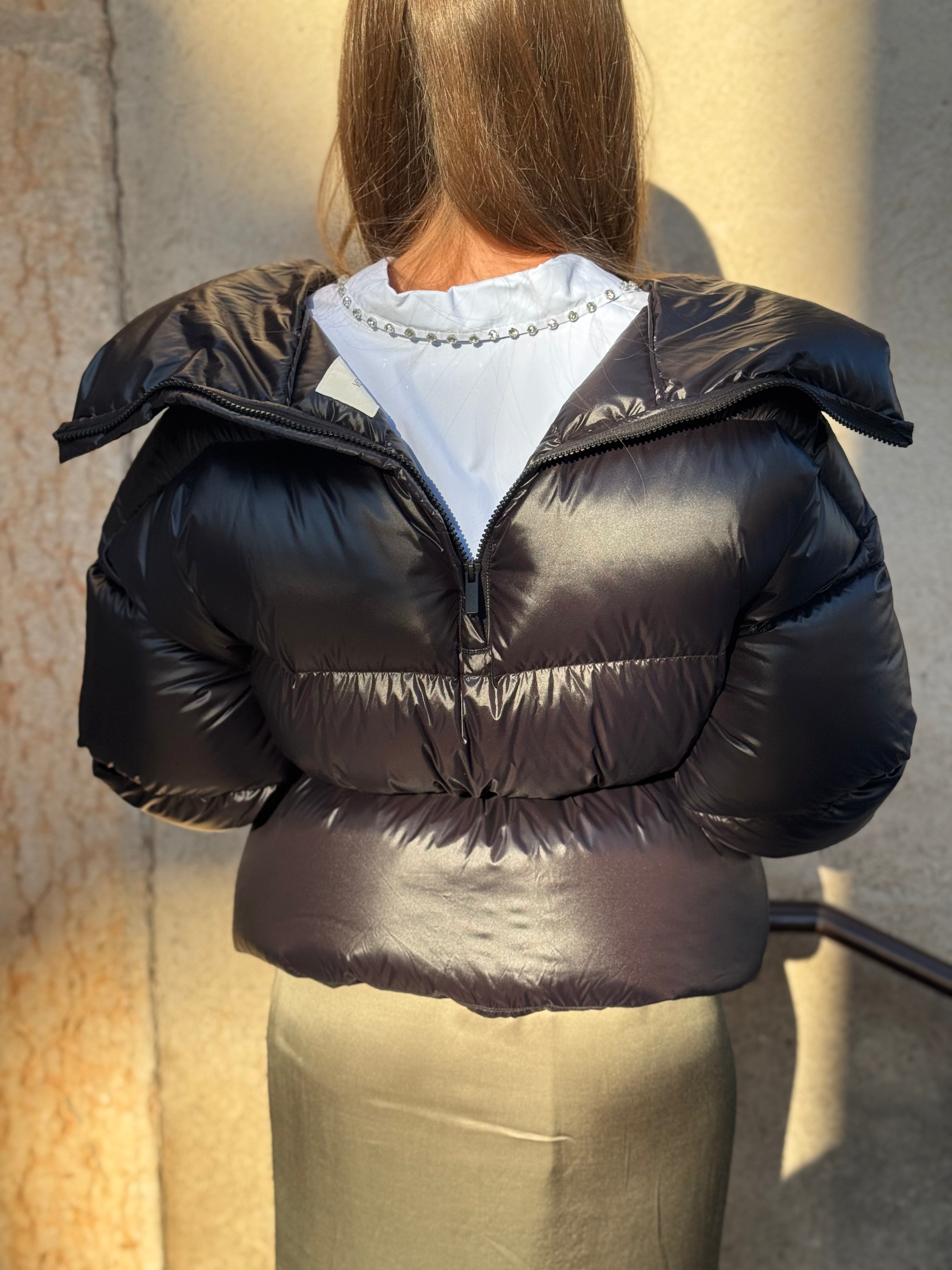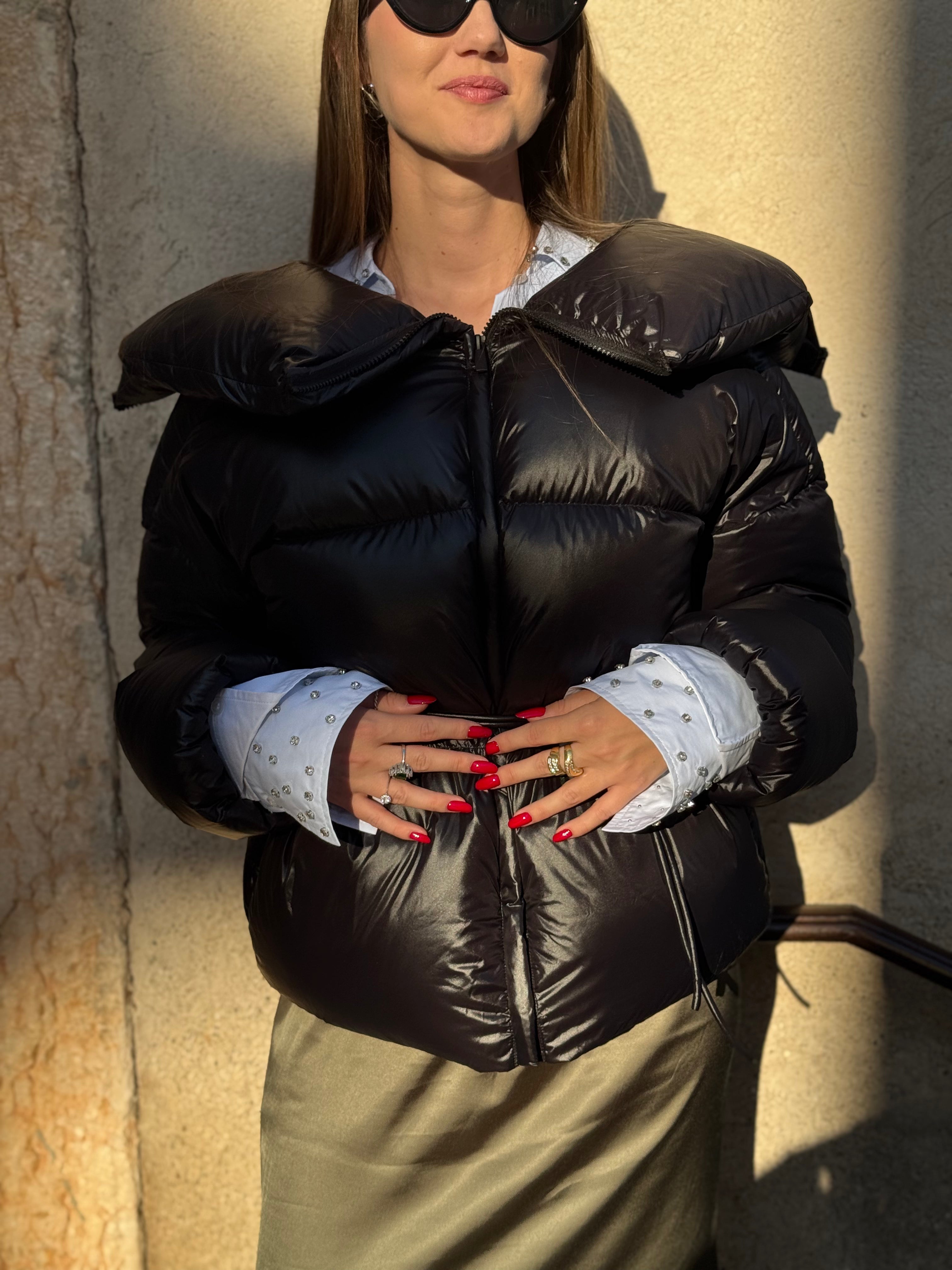 Piumino con chiusura a zip frontale, 2 tasche laterali con chiusura a zip, cerniera sul retro del colletto, cintura removibile da legare in vita