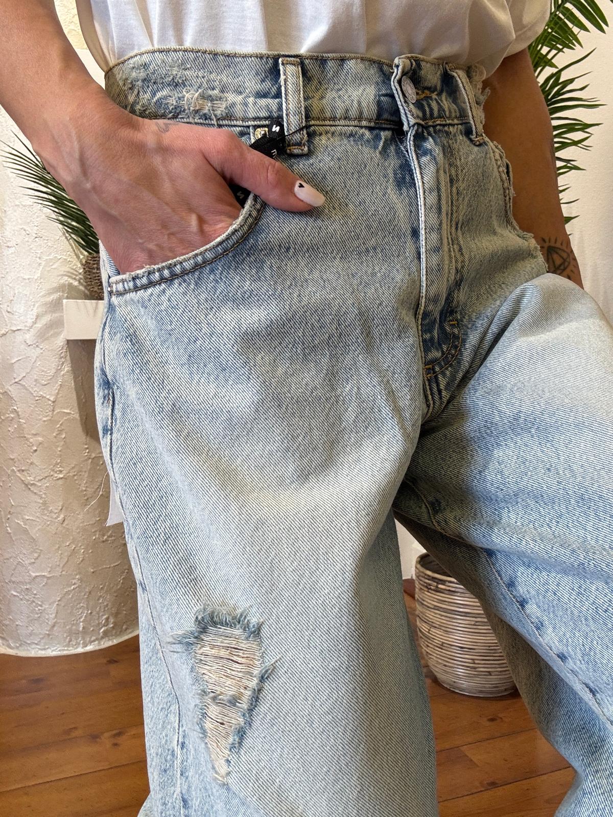 Jeans Haveone Bella slavato chiaro strappi wide leg vita media.