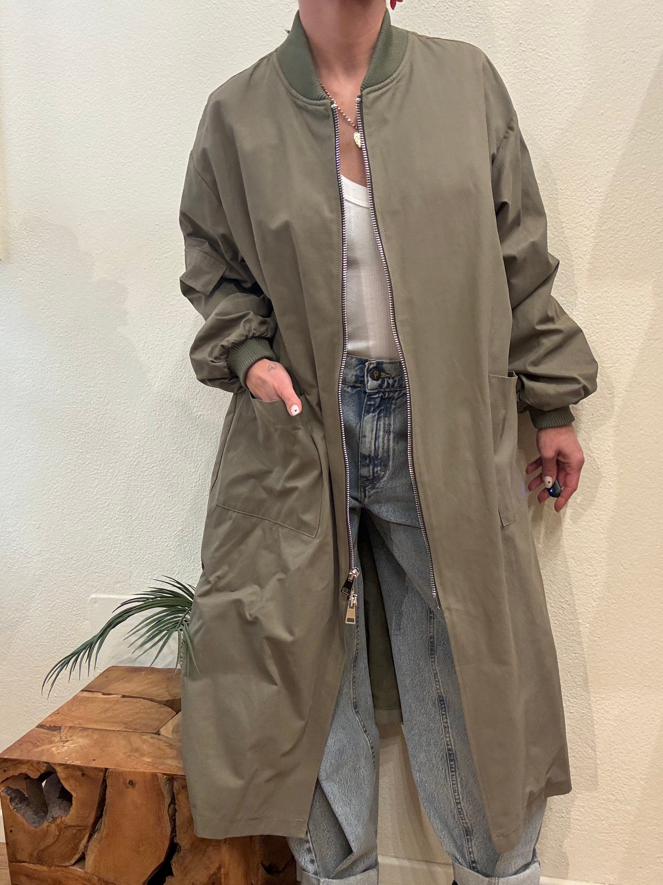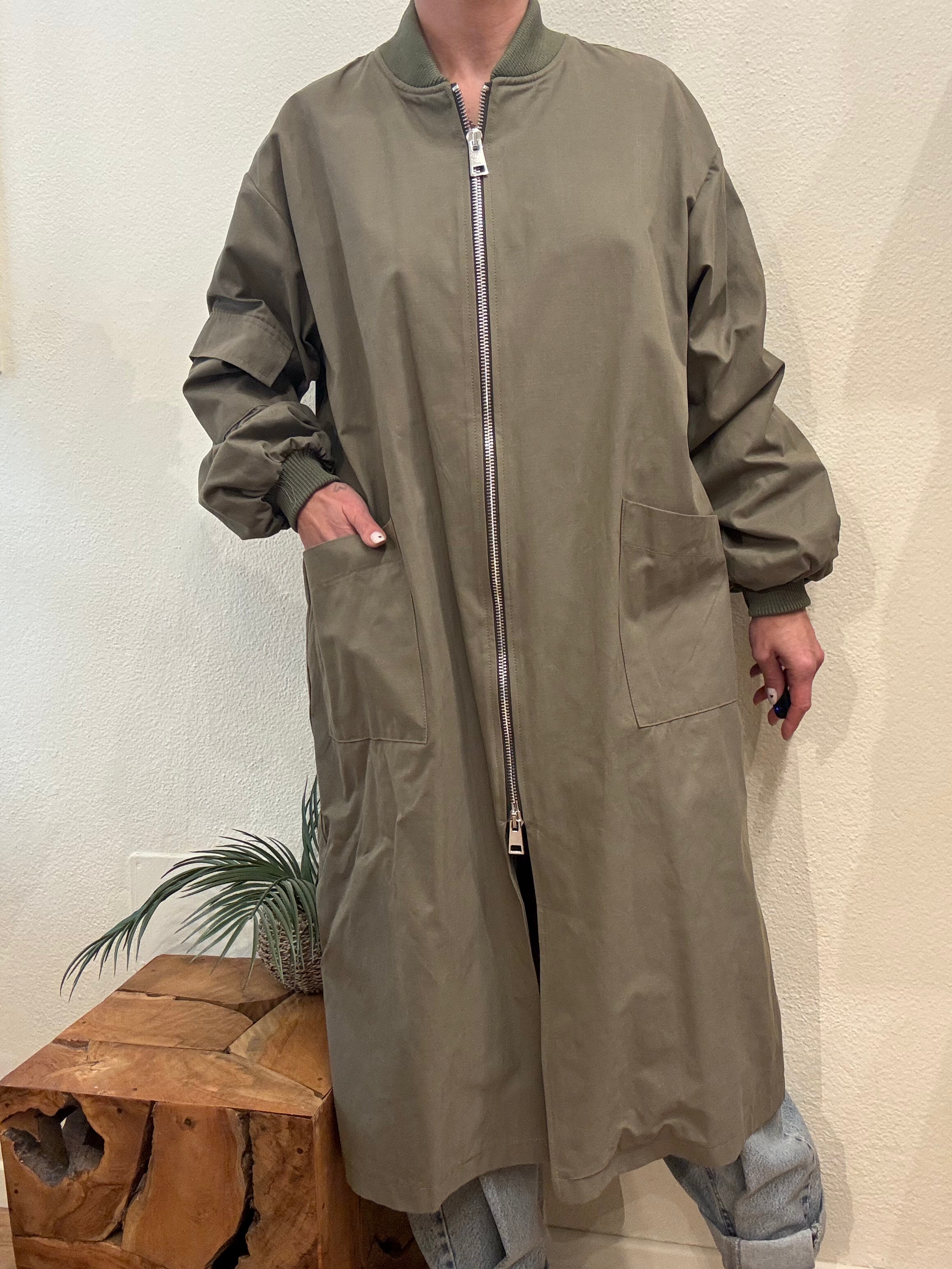 Giacca lunga col. verde militare, doppia tasca frontale chiusura con zip